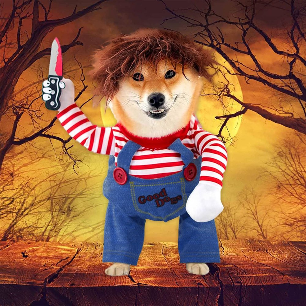 1. **Outstanding Design:** Our chuck dog costume features a padded body with additional padded arms and trouser sleeves. It comes complete with an adjustable wig and a removable knife-shaped attachment, adding a touch of novelty and fun to your furry friend's Halloween attire.