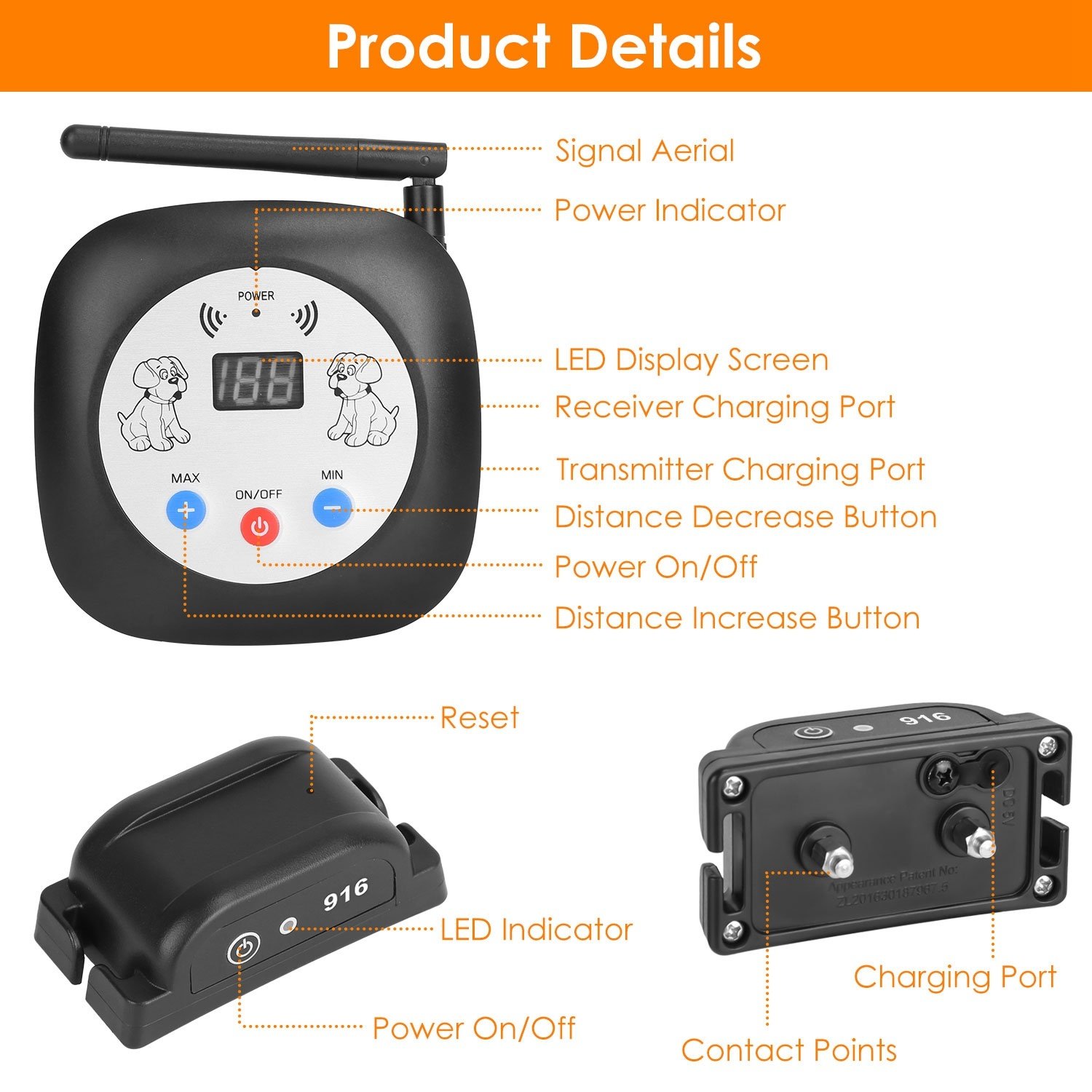 *Safe Efficient Dog Fencing System*:Our stable and effective wireless dog fencing system is designed to make sure your dog stay in the specified and safe area,you will never have to worry about anything when you go outside. Come with beep and vibration working function,when your dog is out of range,the receiver collar will automatically make a beep warning tone for 8S,then beep and vibration warning tone at the same time for 12S until the dog return to the setting distance. After 20cycles of working,the receiver will stop working to prevent any auditory or physical damage. Compared to other electric shocking collar,our dog wireless fence system is much safer to your furry friends.